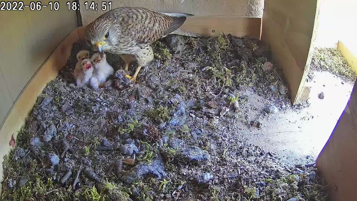video - 08h14 the female hears something, catches a vole, returns and starts to feed the chicks