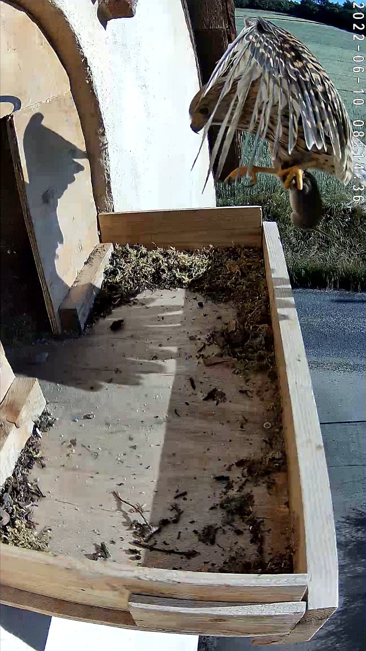 08h14 sequence of female flying to nest with vole; transferring from claw to beak 5