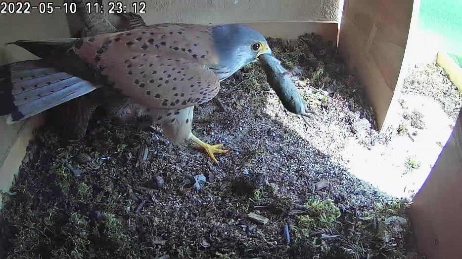 video - 11h23 the male arrives with a vole for the female but departs with the vole still in his beak