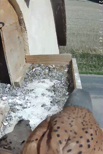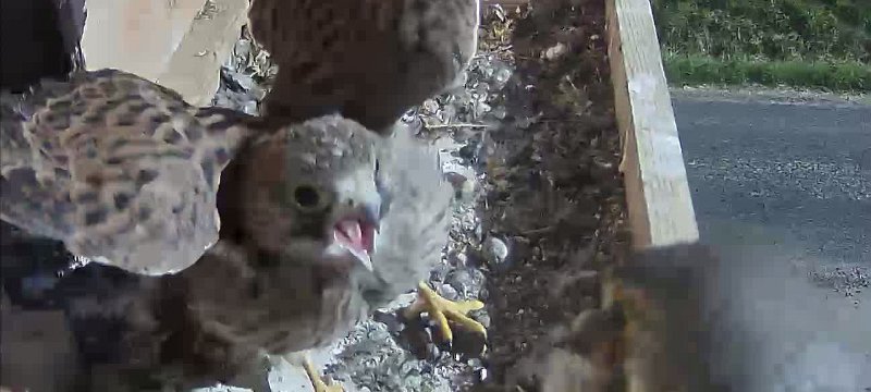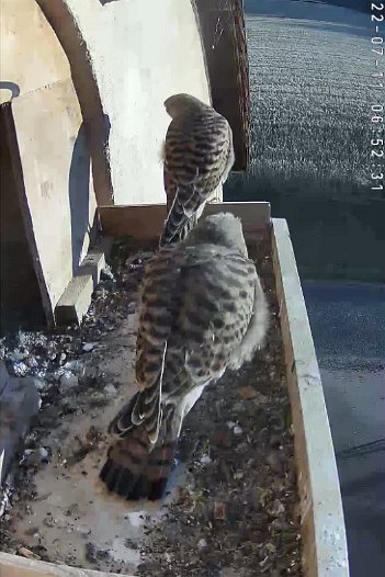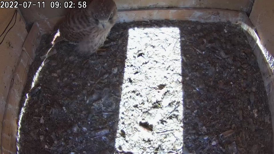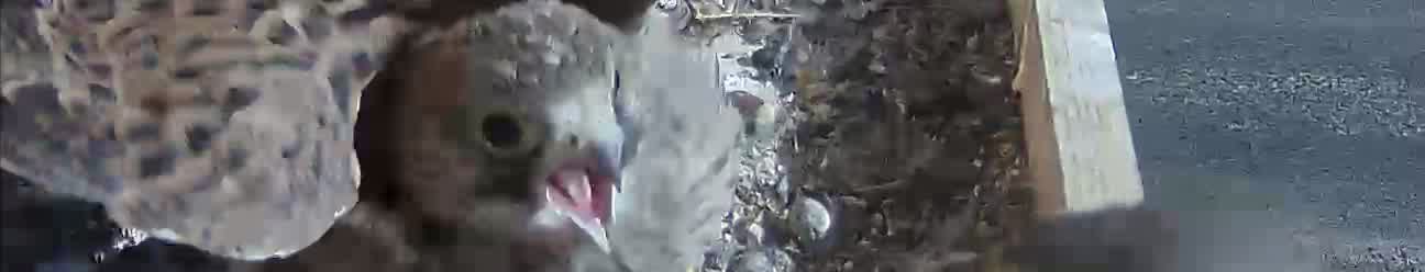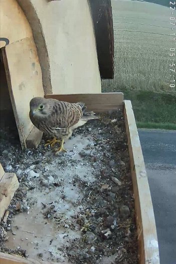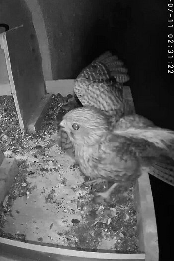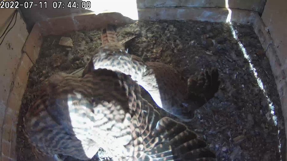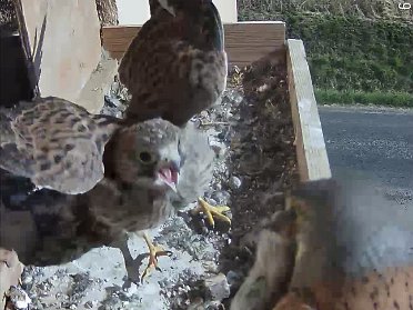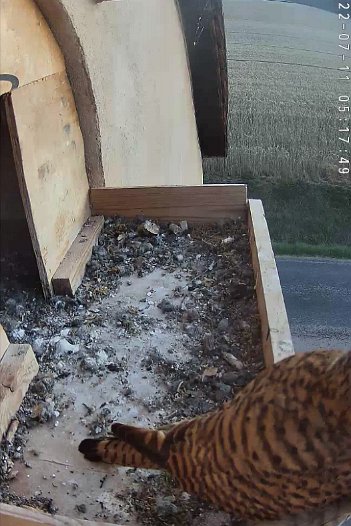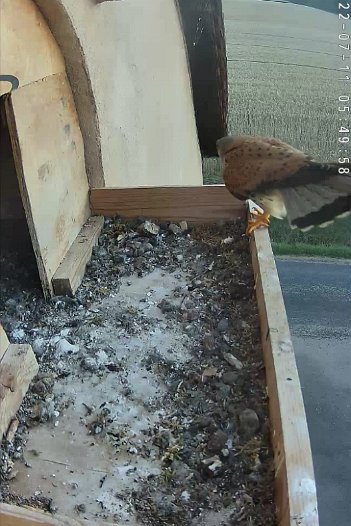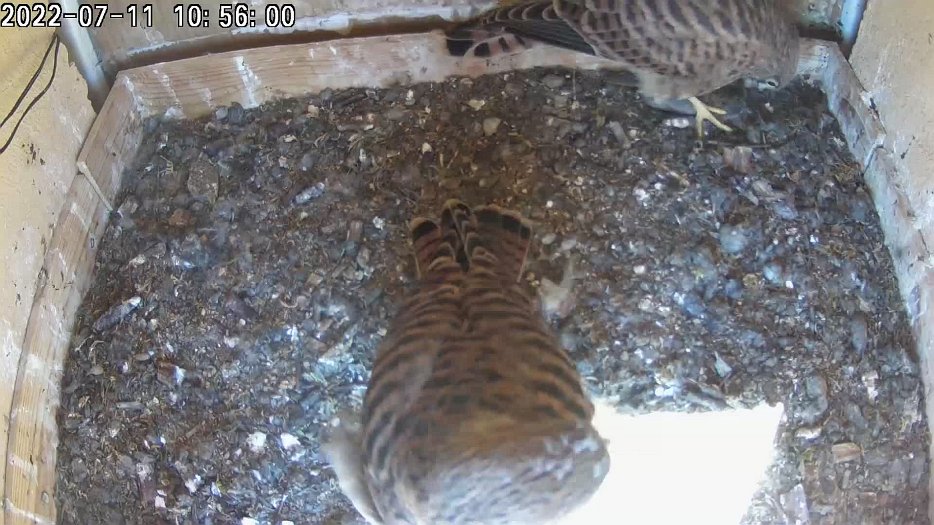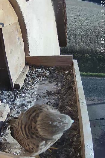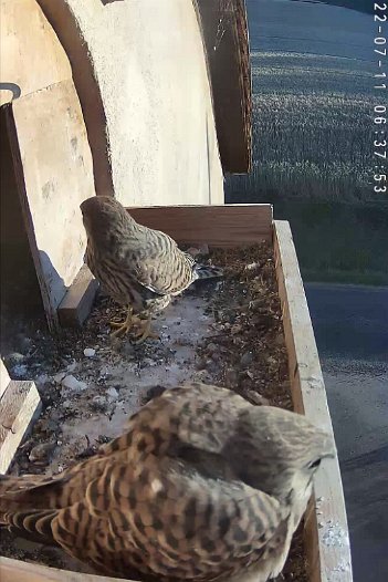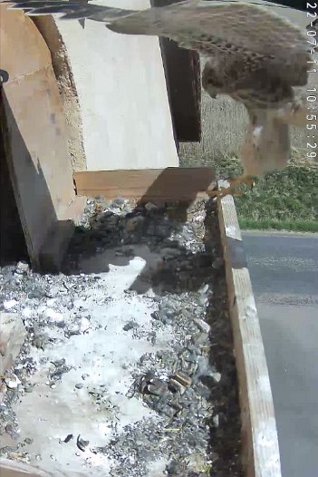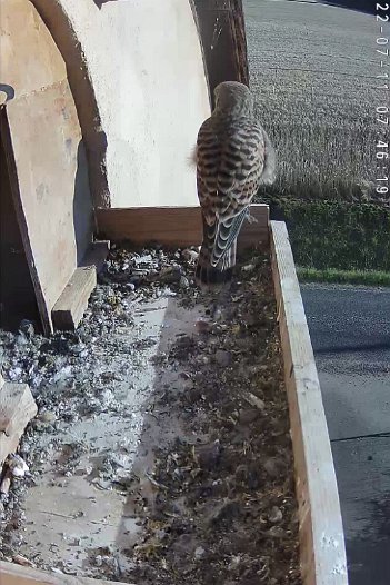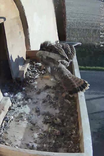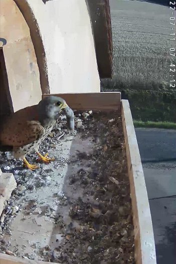 video - 07h41 the male arrives with a vole but there is noone in the nest; then a juvenile returns