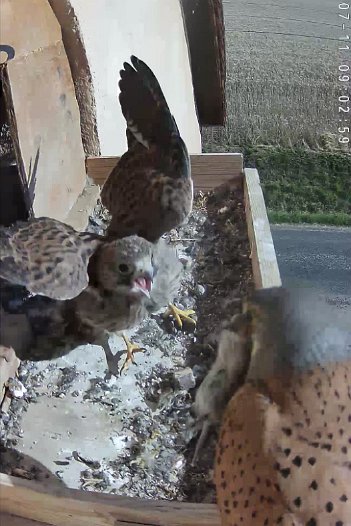 video - 09h02 a juvenile has stayed in the nest and gets the vole from the male