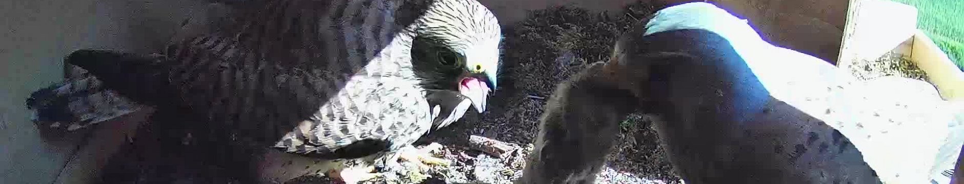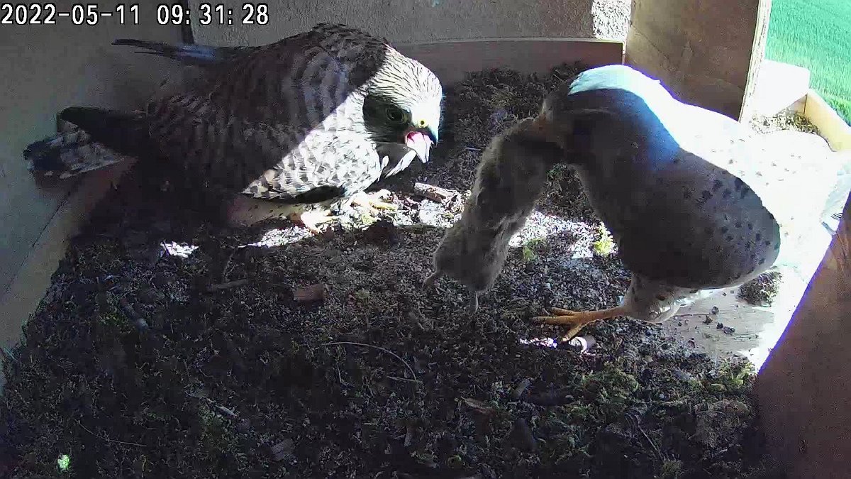 video - 18h28 the female isn't in the nest; the male arrives with a vole and the female flies in, grabs it, and departs