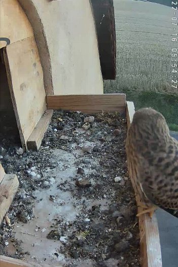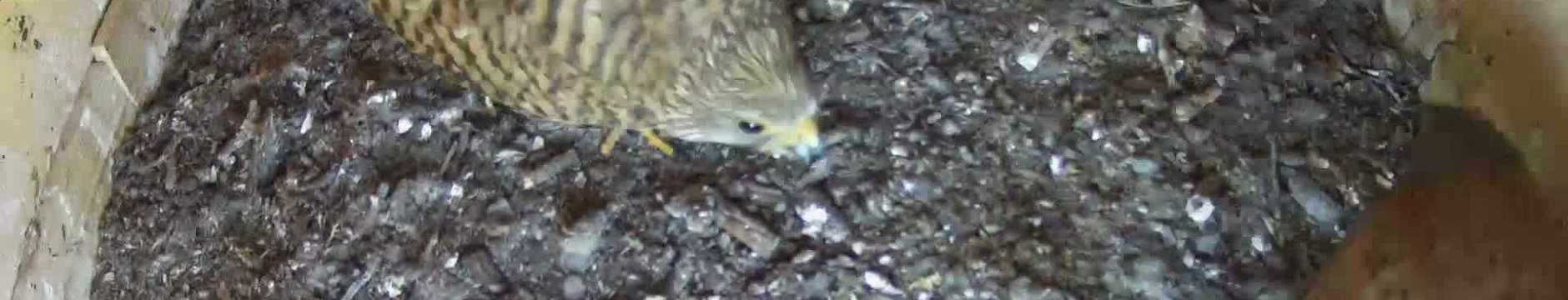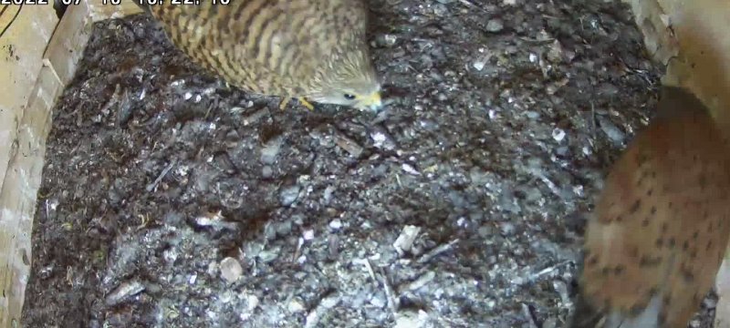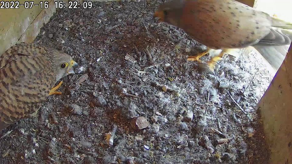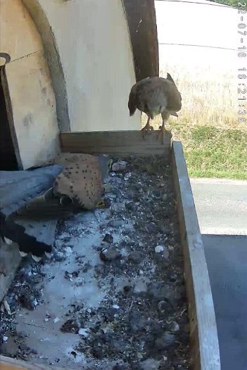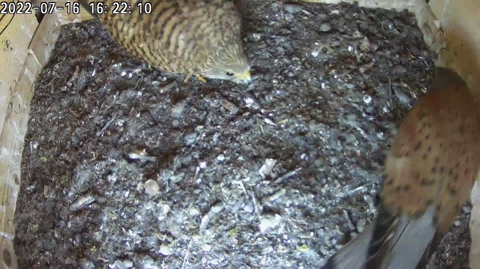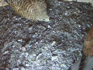 video - 16h20 the male arrives and calls out; the female arrives; the male jumps up and knocks both off. the female returns and enters the nest; the male returns and departs; later the female departs
