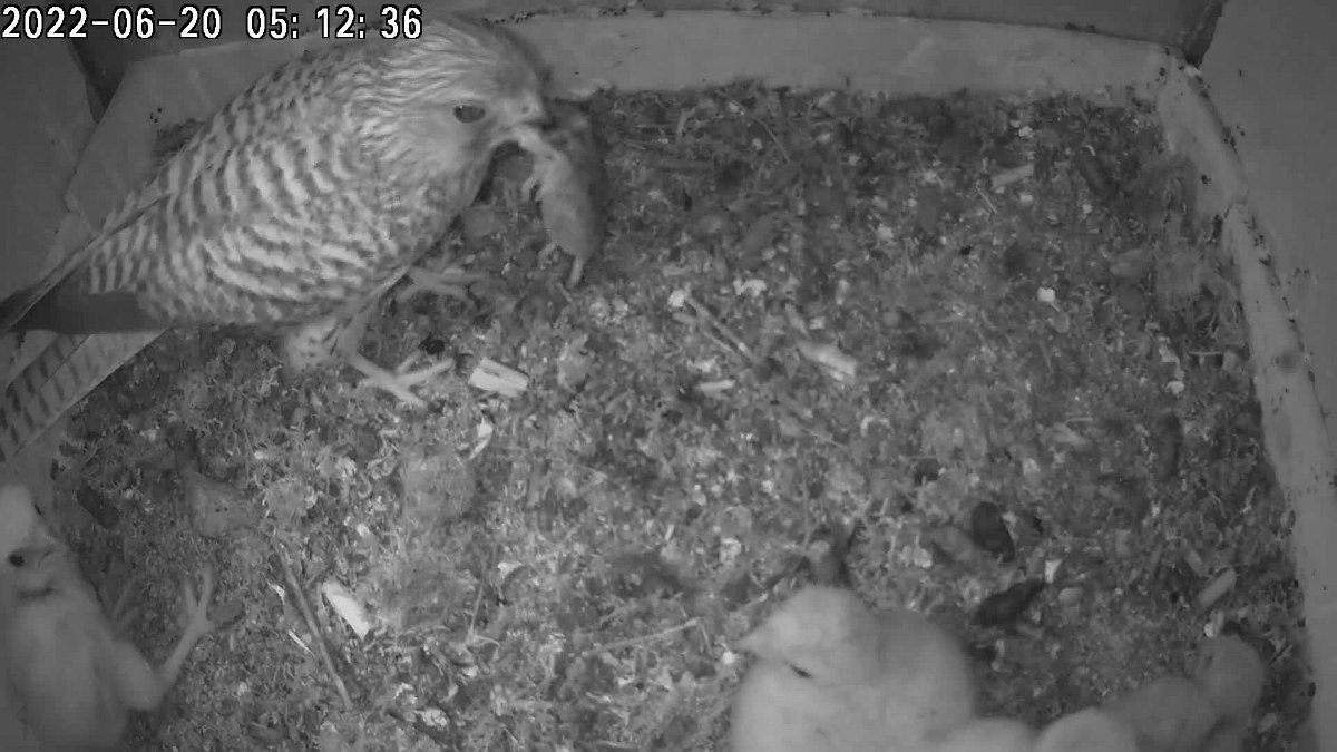 video - 06h04 the female brings a mouse and feeds the chicks and ...