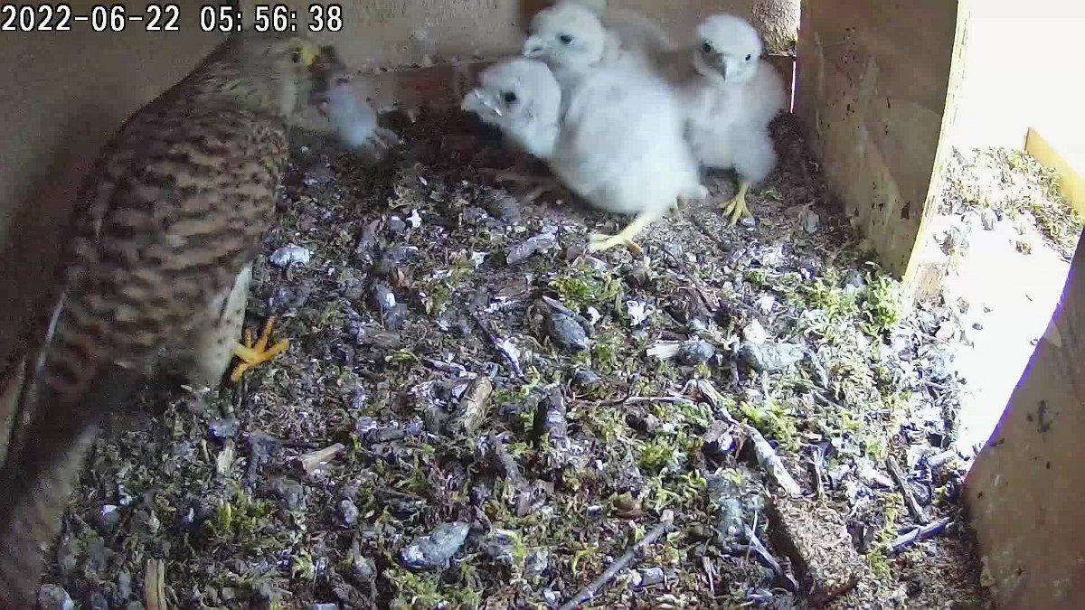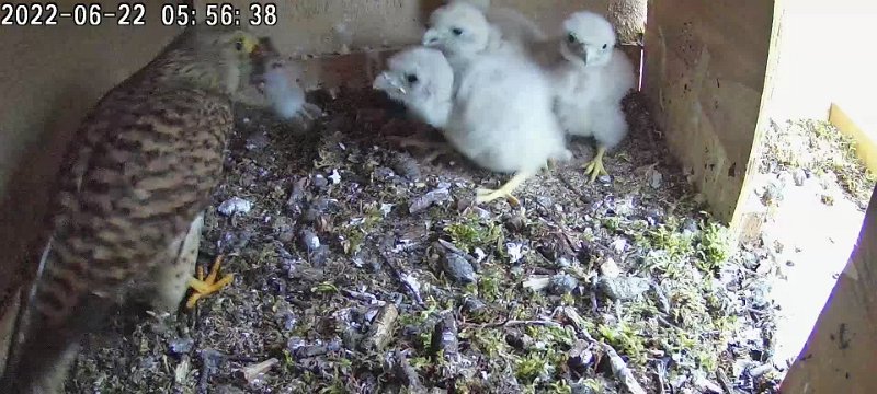 video - 14h56 the femal brings a vole which one chick takes. The chicks then peck at the remains