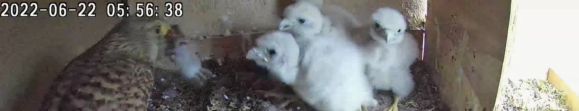 video - 20h57 the female brings a mouse, departs it, then helps the chicks share it