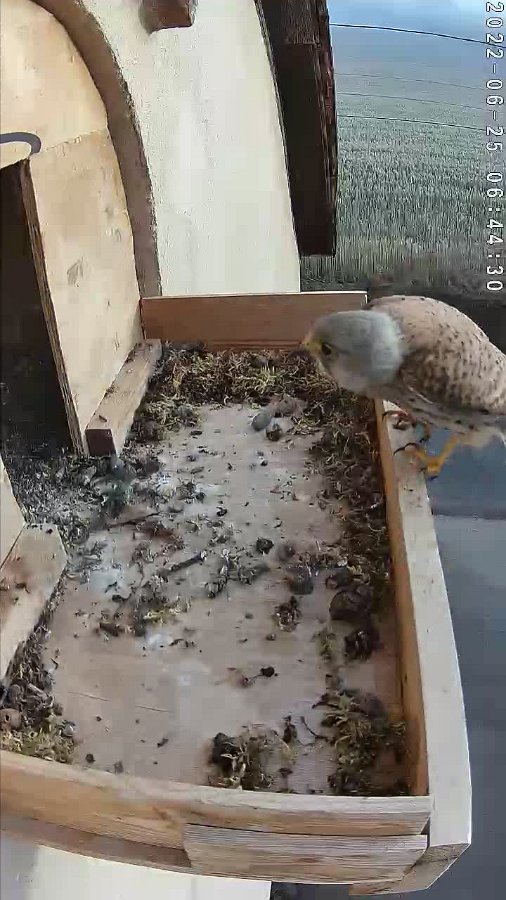 video - 09h21 the female arrives with a vole and a chick at the entrance grabs it