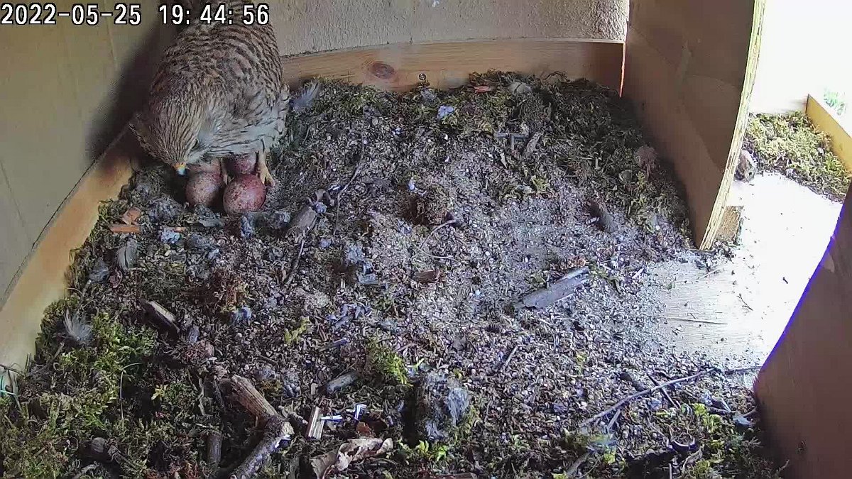 video - 19h44 female preening and getting comfortable1 video - 22h47 the female is sitting in the eggs when an owl arrives outside2 video - 22h47 the owl arrives3 26 may 202224 may 2022