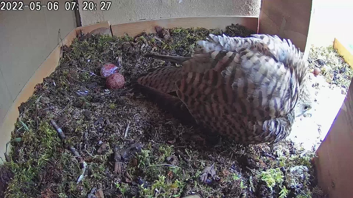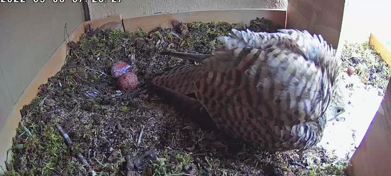 video - 13h00 male arrives with vole. First time in the nest since the second egg was laid the previous evening
