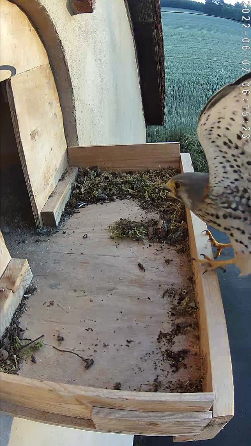 video - 06h15 the female hears the male outside and departs; the male enters and sits on the eggs for a short time