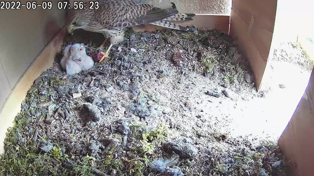 video - 14h14 the feeding finishes, the female hides the remaining food in the corner and sits on the chicks