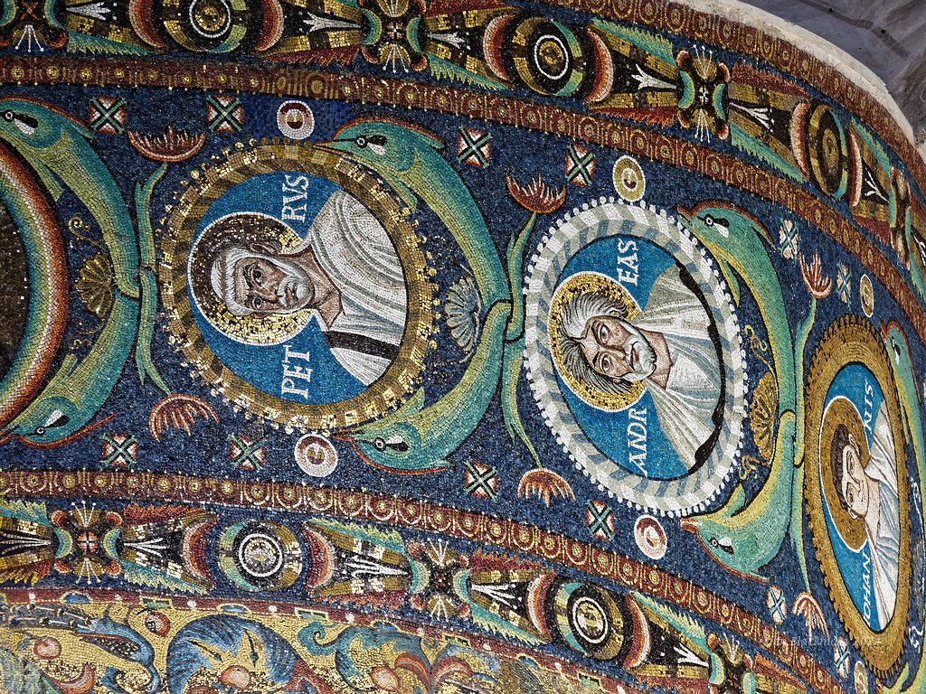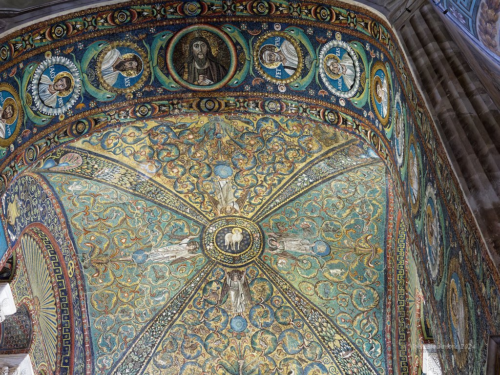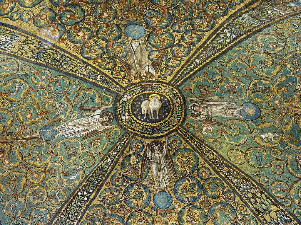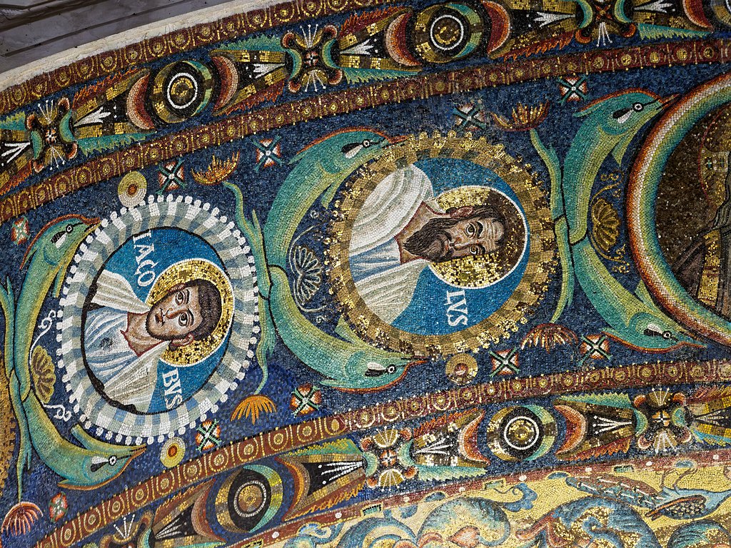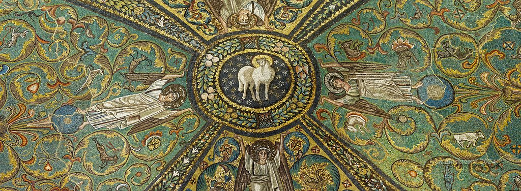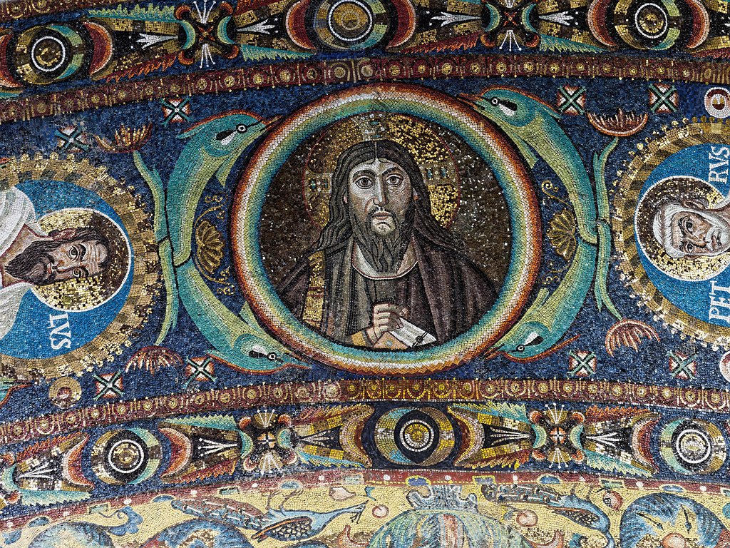 Christ, two archangels offering crown of martyrdom to St Vitalis with bishop Ecclesio
