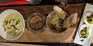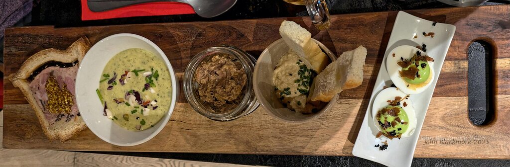 Starters - pork pie; raita; pimento pate; hummus; eggs