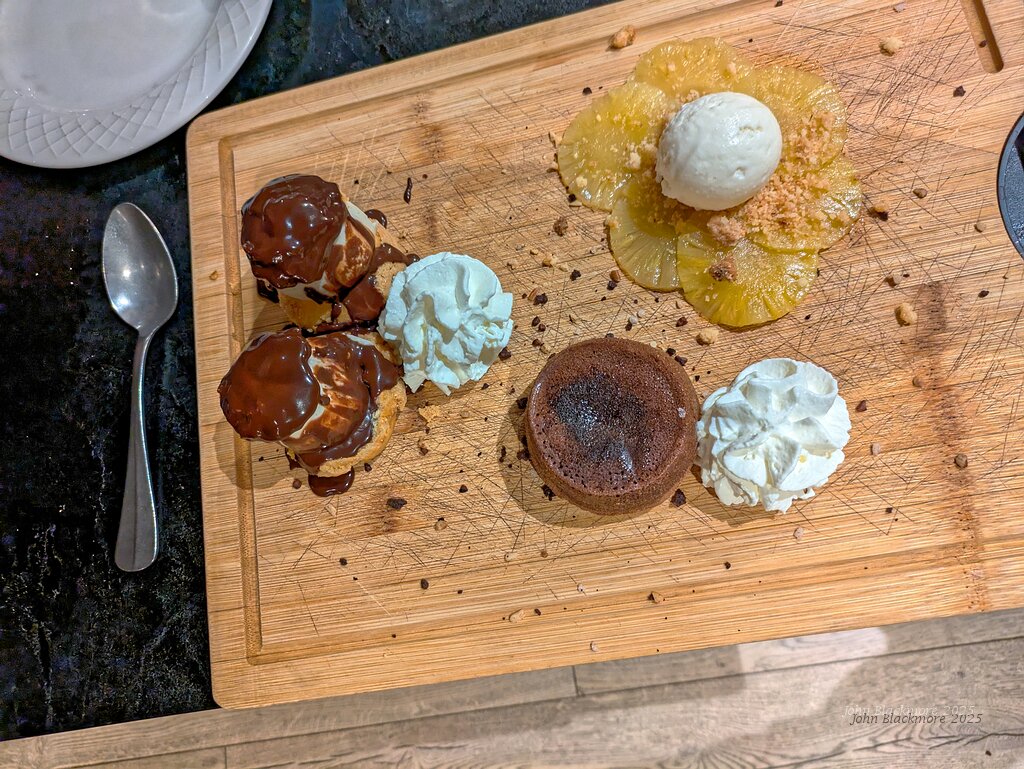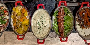 octopus; mixed vegetables: potato, cheese and garlic aligot: duck breast; pork ribs