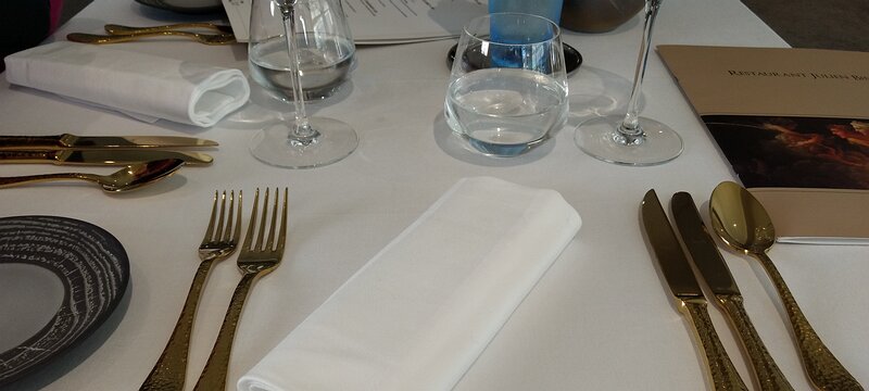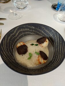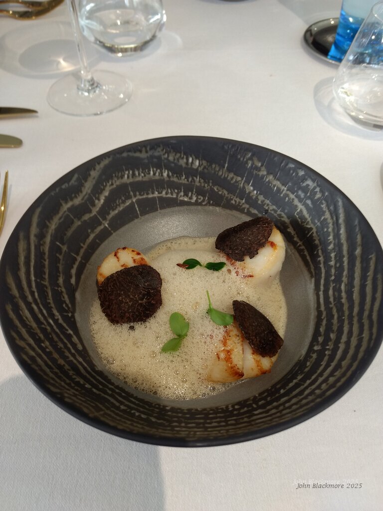 Noix de Saint Jaques rôties, risotto de cèleri au parmesan et bouillon de cèleri beurré au jus de truffes