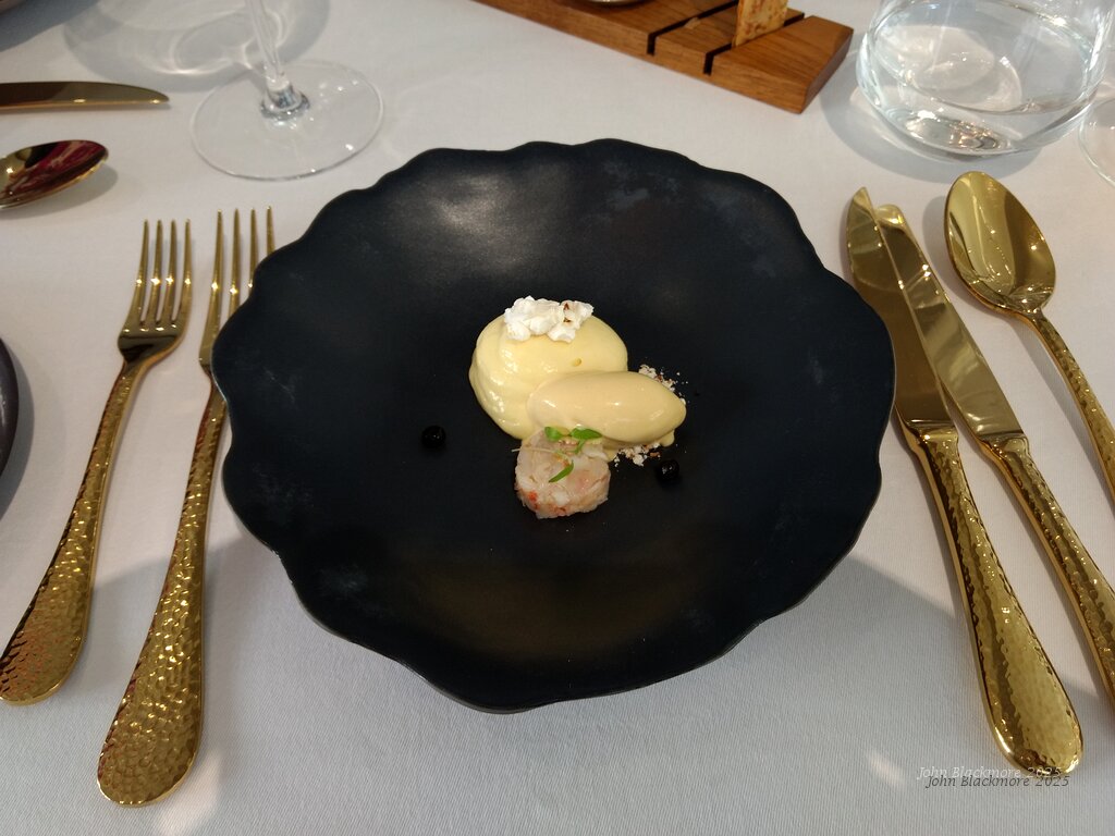amuse bouche: marinated shrimps with corn cream, corn ice cream and popcorn--