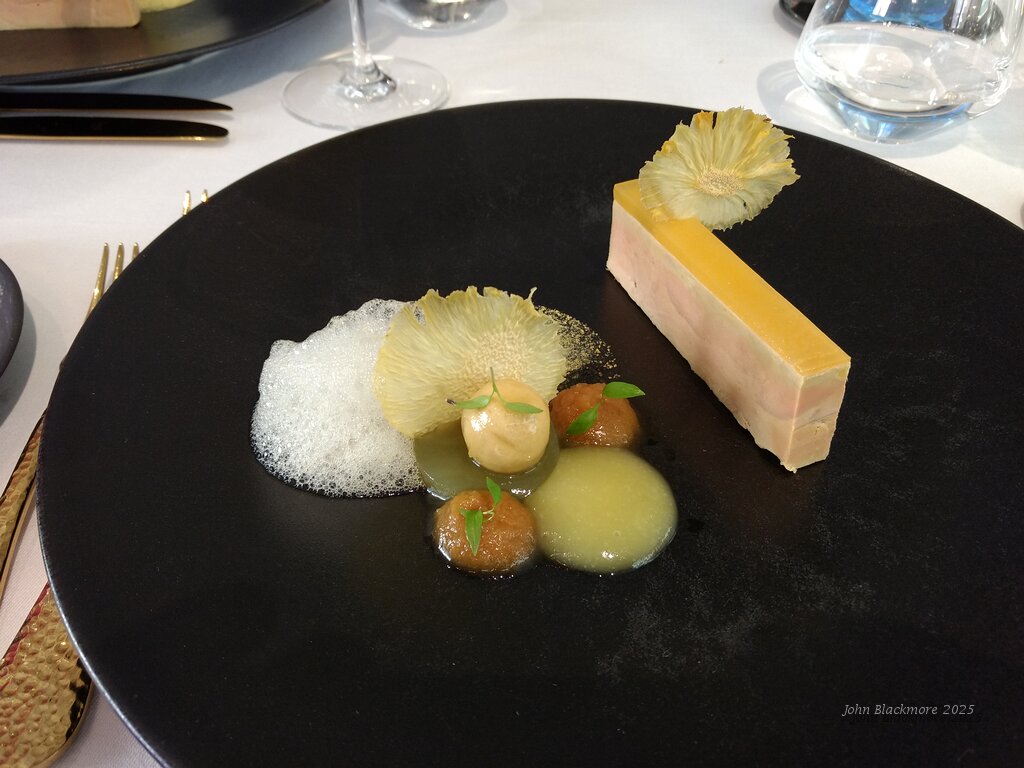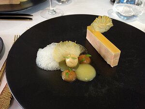 Lightly-smoked duck foie gras and a foie gras ball with pineapple chutney, pineapple jelly and dried pineapple