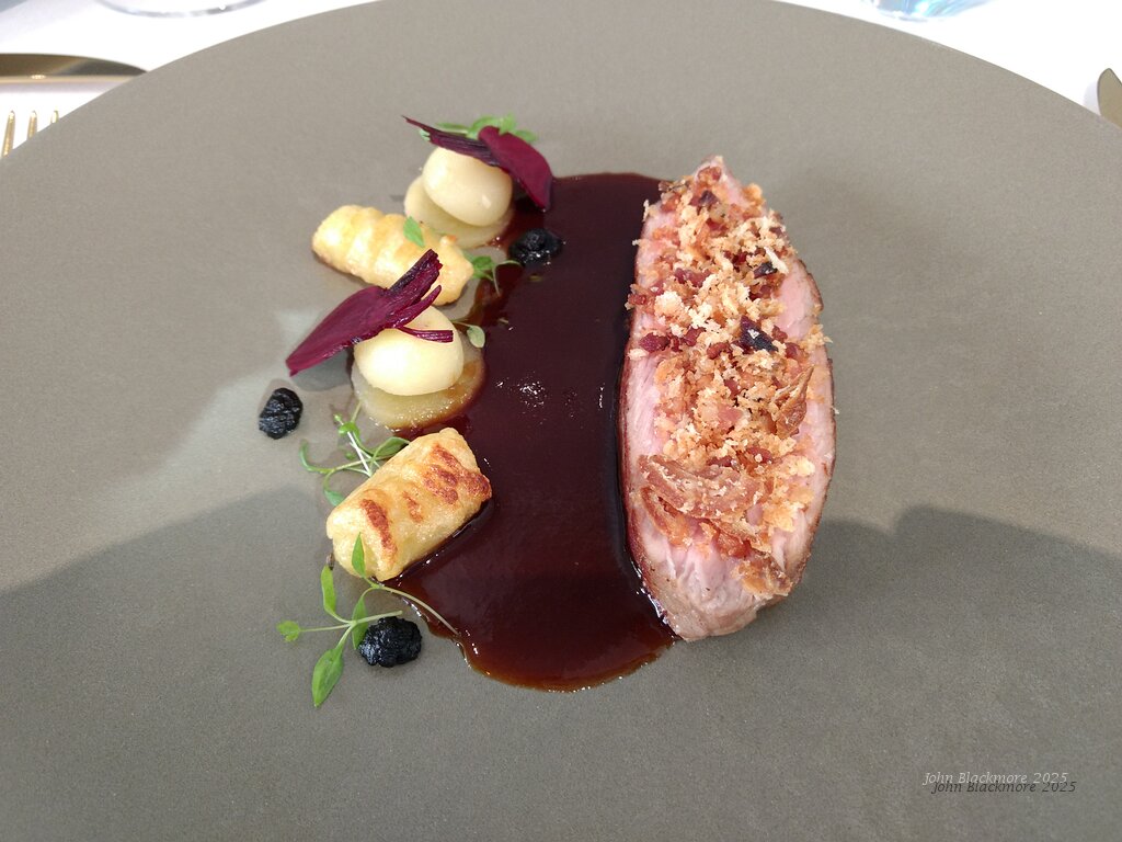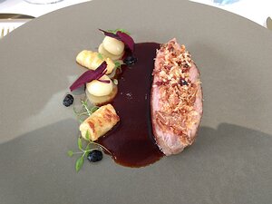 Pointe de veau rôtie, condiments secs, légumes racines mijotés (parsnips, potatoes and beetroot), jus d’oignons doux caramélisés