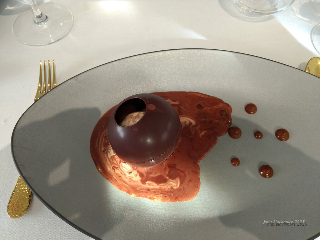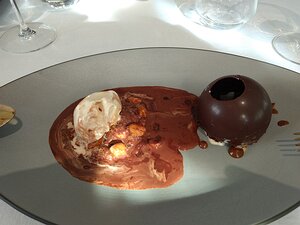 La sphère chocolat caramel, chouchou (caramelised hazelnuts), glace cacahuète, chocolat chaud Illanka