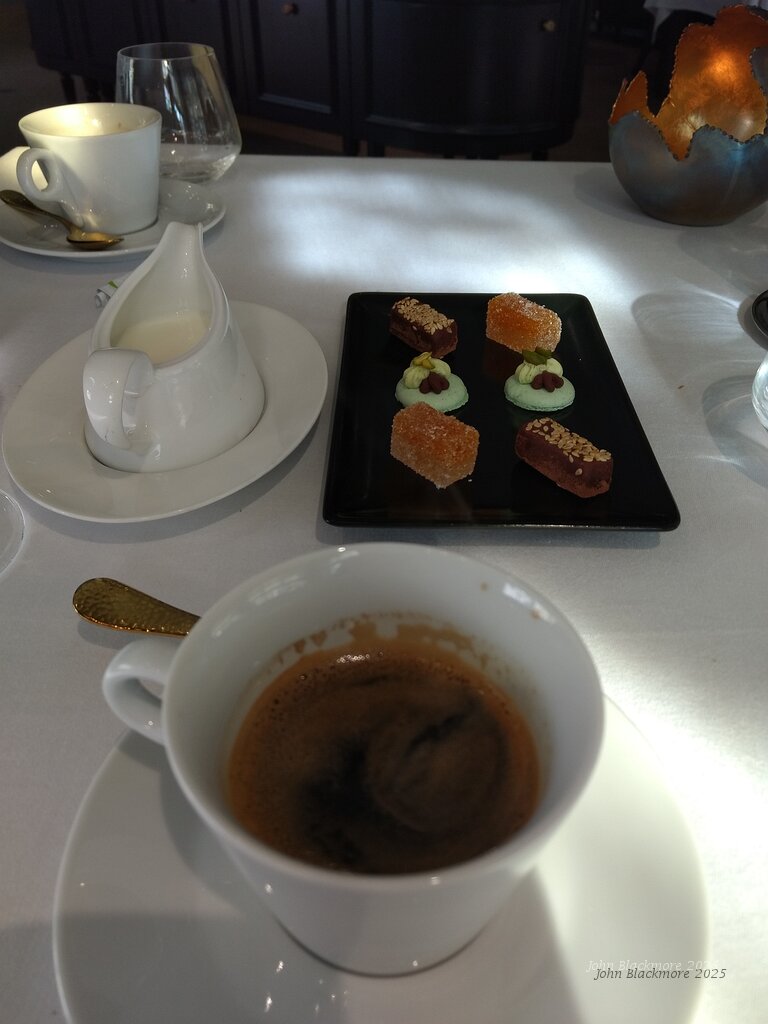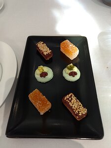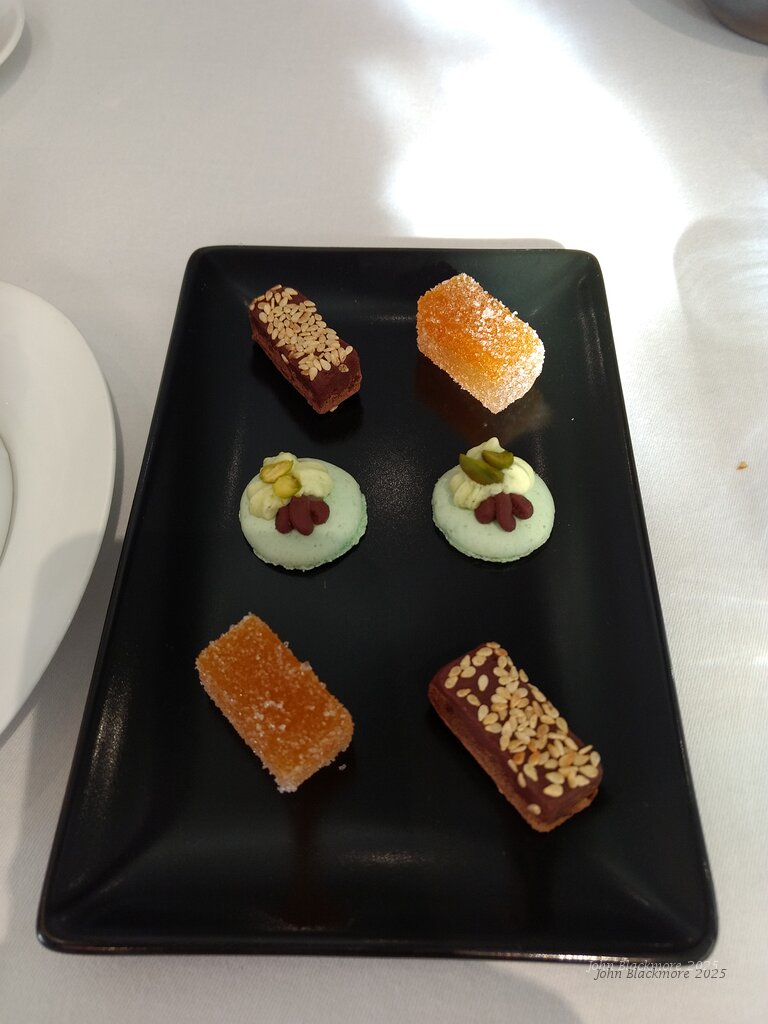 Mignardises: chocolate truffle, pistachio macaroon, mango jelly