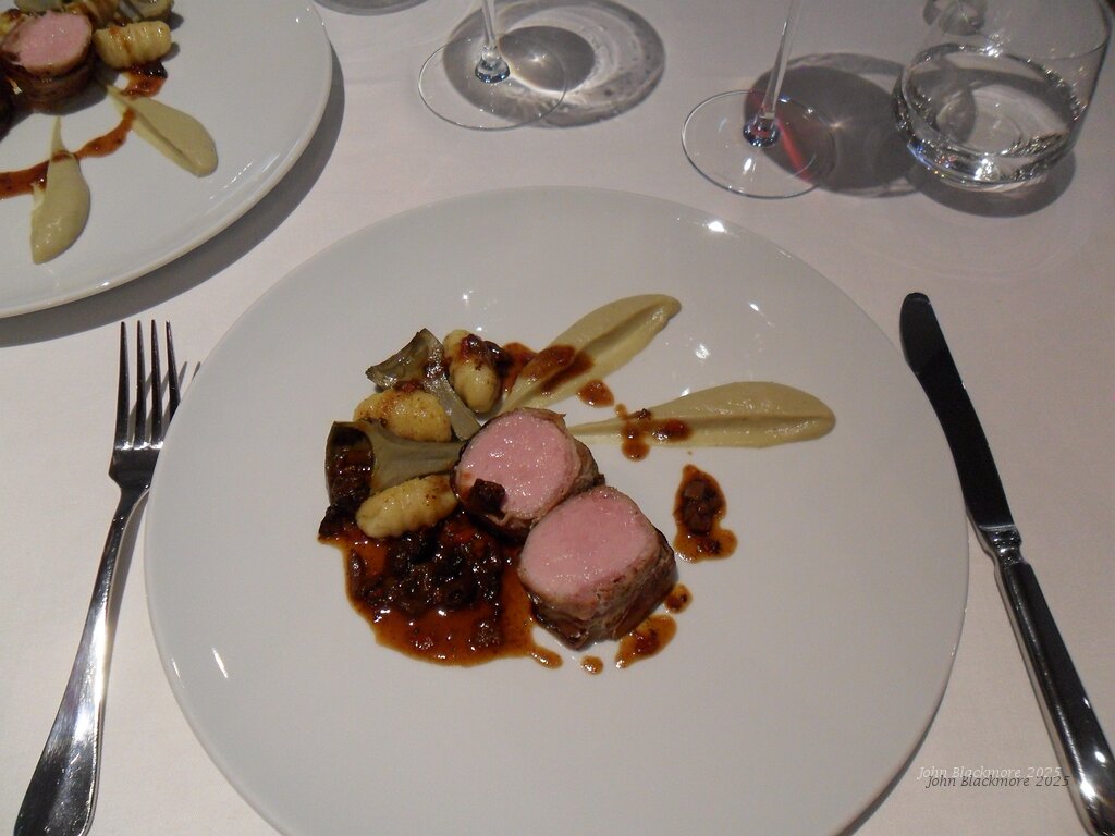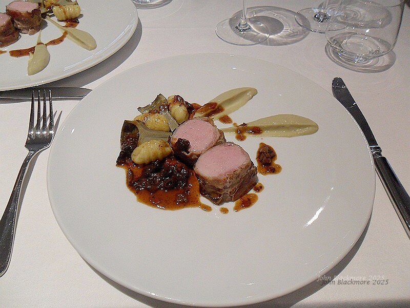 main - Quasi de veau en croûte de lard, mousseline d'artichaut, gnocchis maison, jus corsé aux olives
