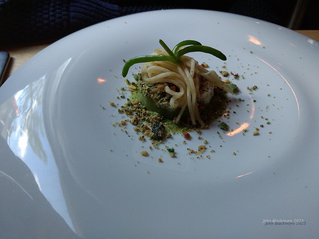 first course: Crab, avocado cream, bacon, daikon (white radish) spaghetti
