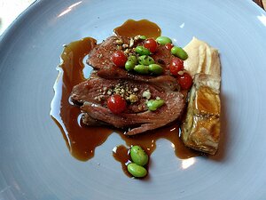 fourth course: roast lamb neck, hummus, aubergine, tomberry tomato, broad beans