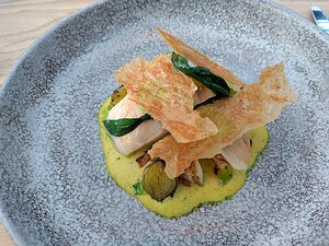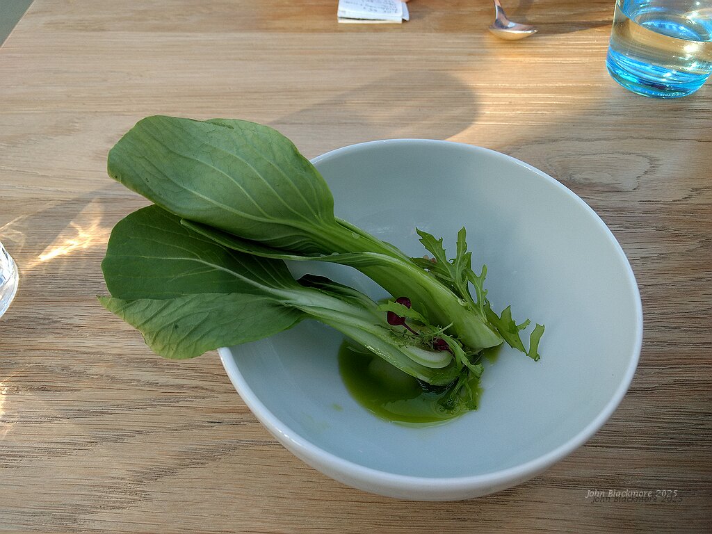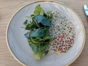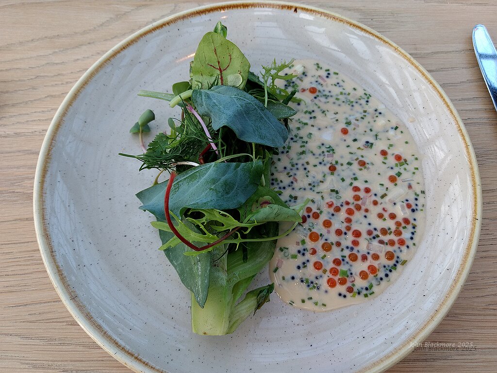 second course: beurre blanc sauce with trout eggs and tobiko eggs with roast lettuce, samphire and oyster leaf
