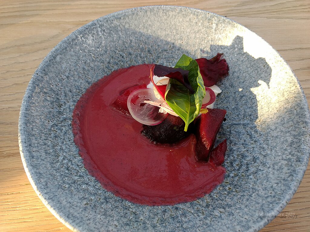 first course: beetroot gazpacho with mint and Greek basil and Buratta cheese