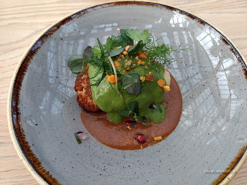 third course: roast cauliflower on Mexican mole sauce with green tomato sauce on top and ...