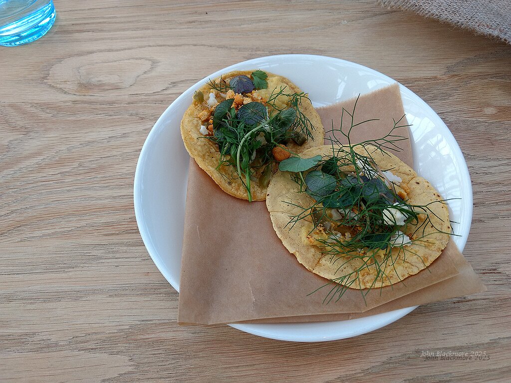 corn taco and cauliflower pieces, corn, nasturtium and dill