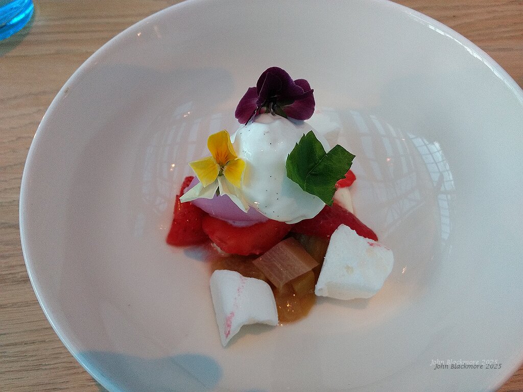fifth course: strawberry, rhubarb, violet lemon sorbet, pansy flowers and meringue