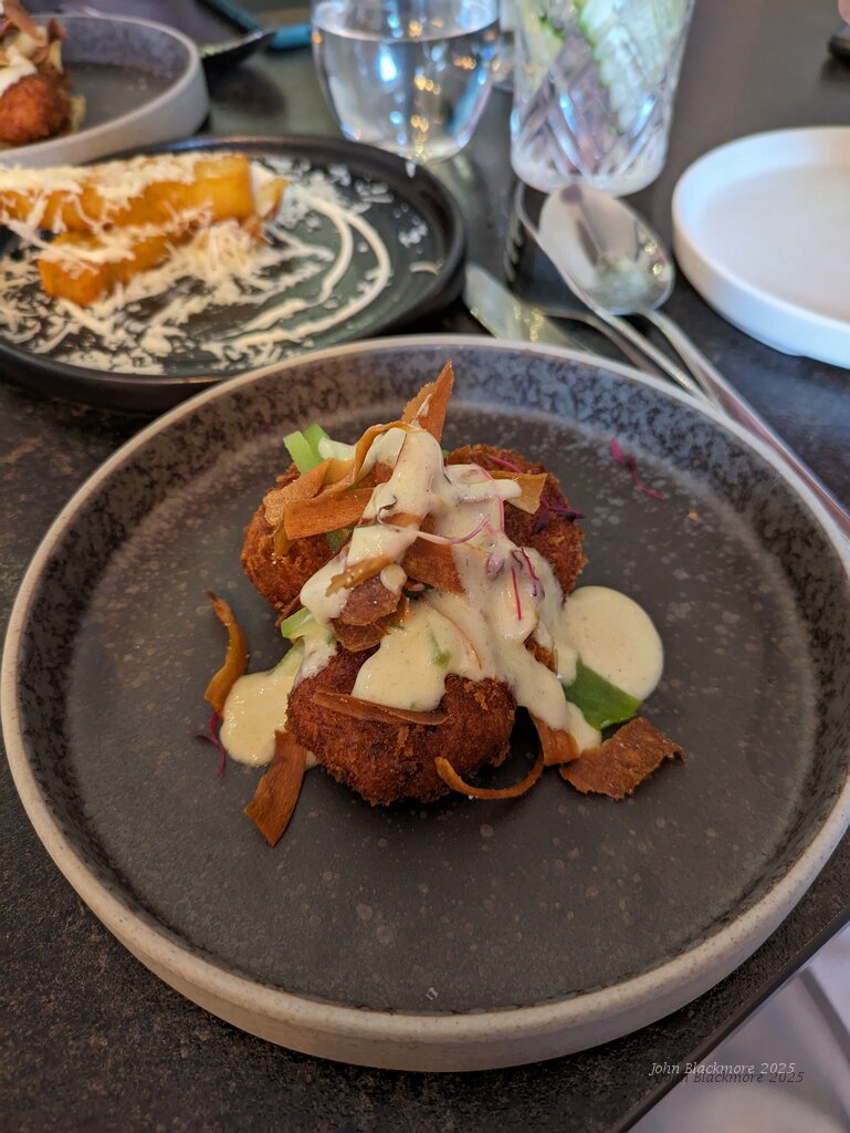 Miso cod croquettes, parsnip purée, lardo, parsnip crisps, vanilla beurre blanc
