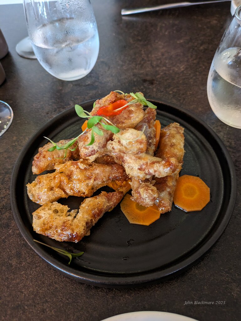 Crispy chilli beef, carrot purée, furikake, pickled carrot, black rice vinegar glaze
