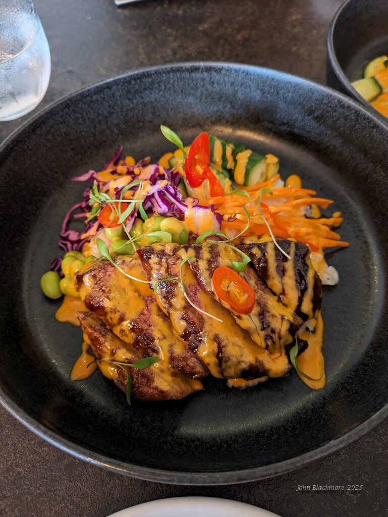 Spicy Korean steak poke bowl, steamed sushi rice topped with edamame, cucumber, cabbage, avocado purée & sriracha mayo