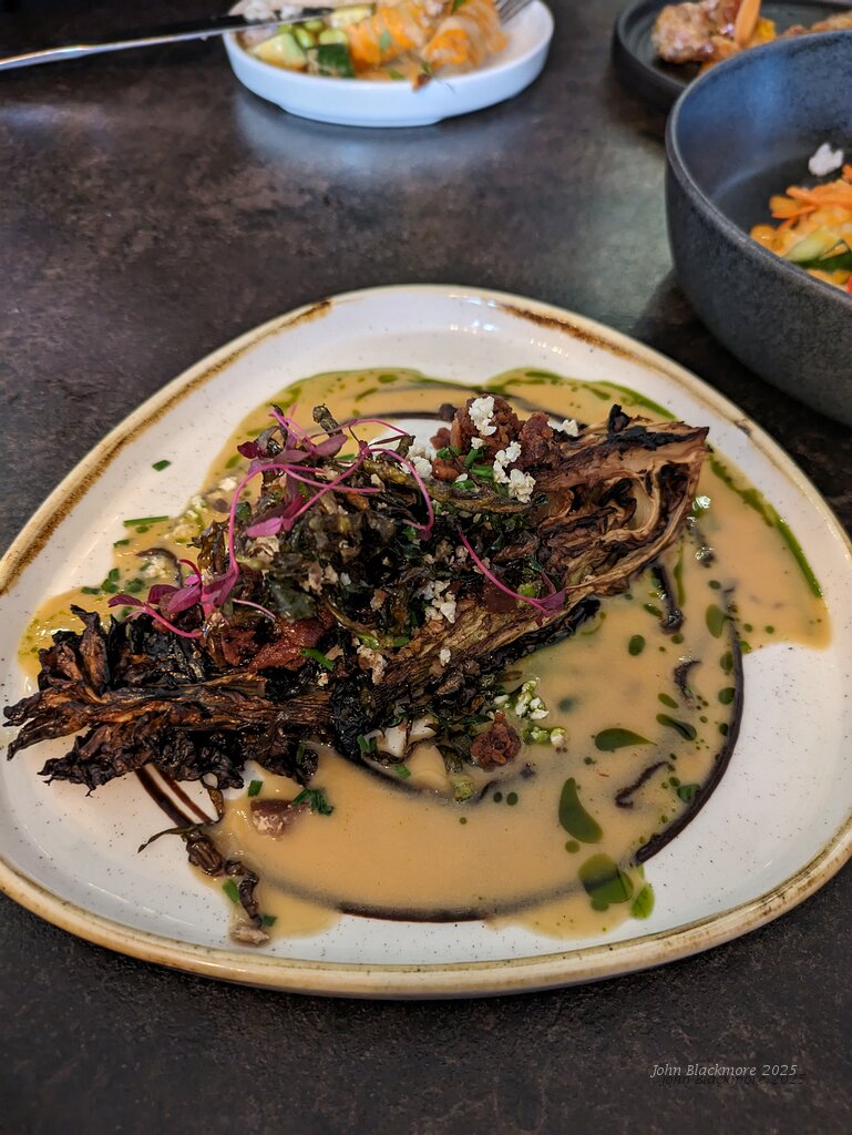 BBQ hispi cabbage, lardo, pork puff, black garlic, smoked bacon velouté, chive
