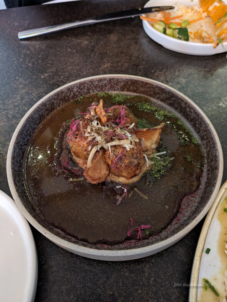Turkey bon bons, Jerusalem artichoke purée, Brie, truffle, Pecorino, turkey jus
