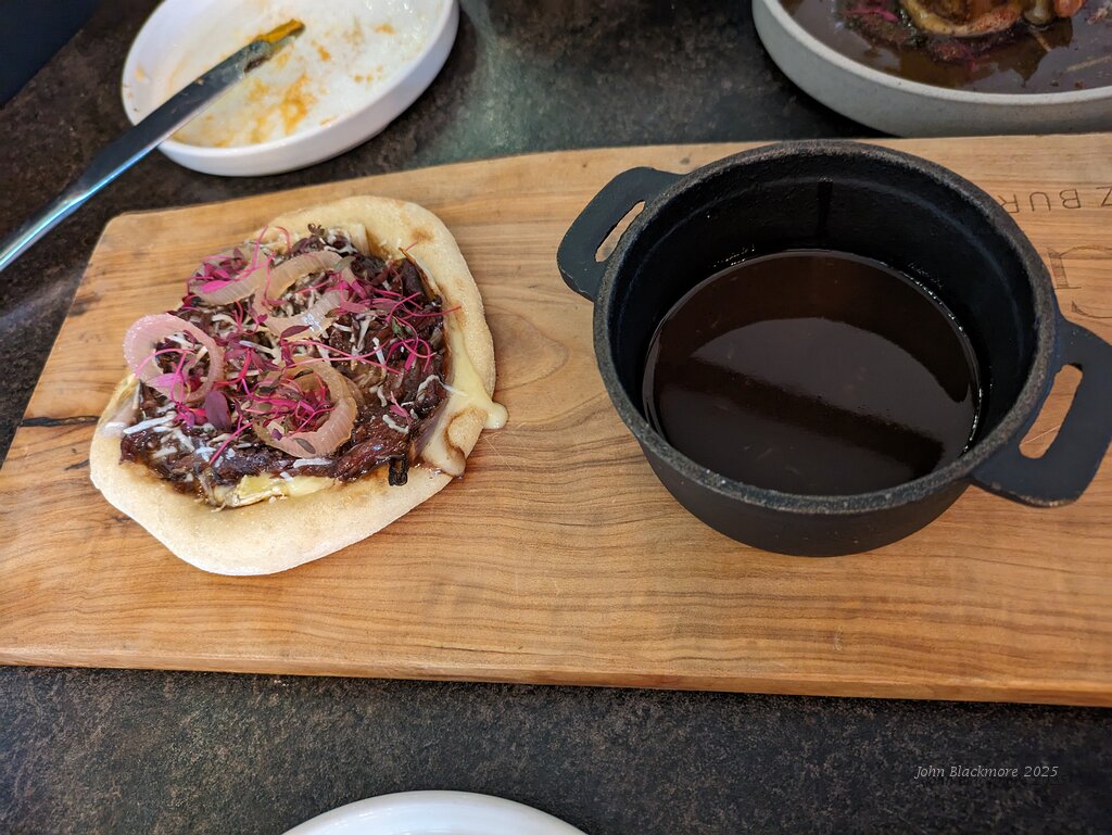 Ox cheek flat bread, harissa, cucumber, pomegranate, roasted pepper, yoghurt