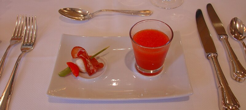 Amuse bouche: pastèque (water melon) soup, pancetta, cheese
