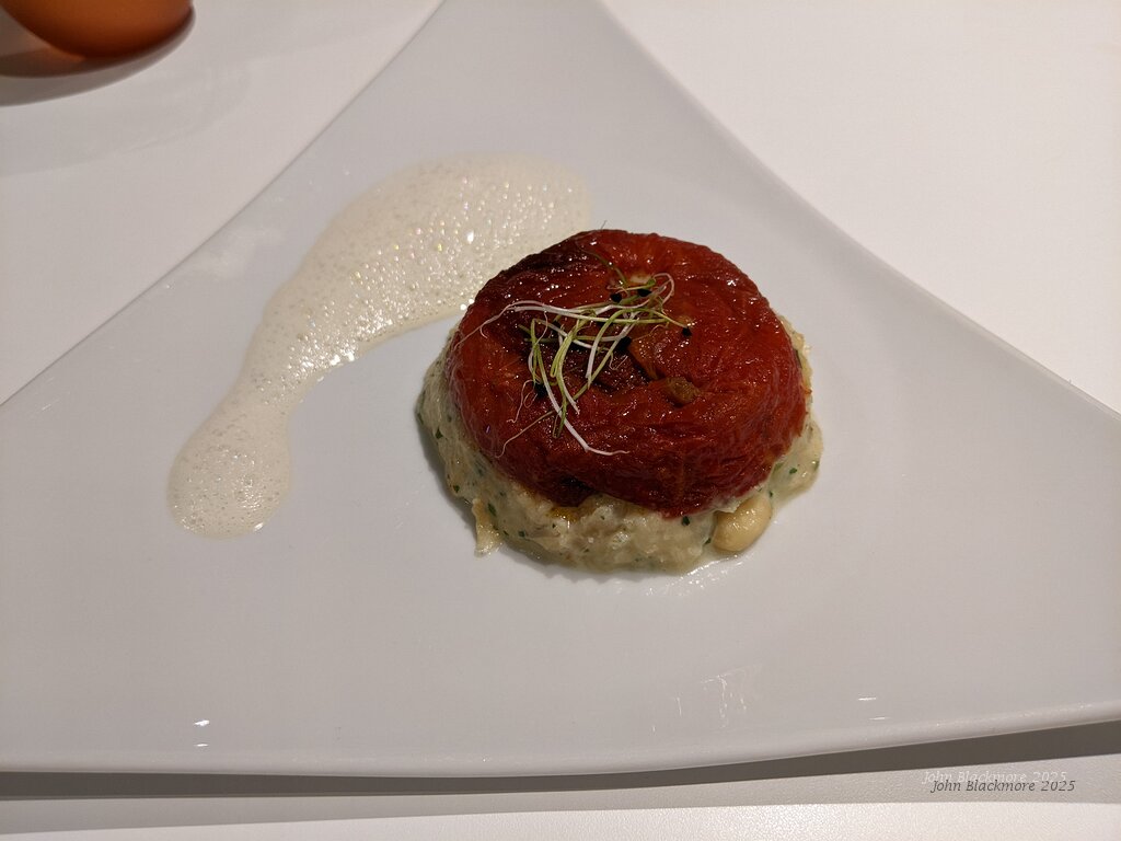 first: Poype (a mound) de grenouilles désossées au beurre de Bresse et tomates confites, émulsion à l'ail doux