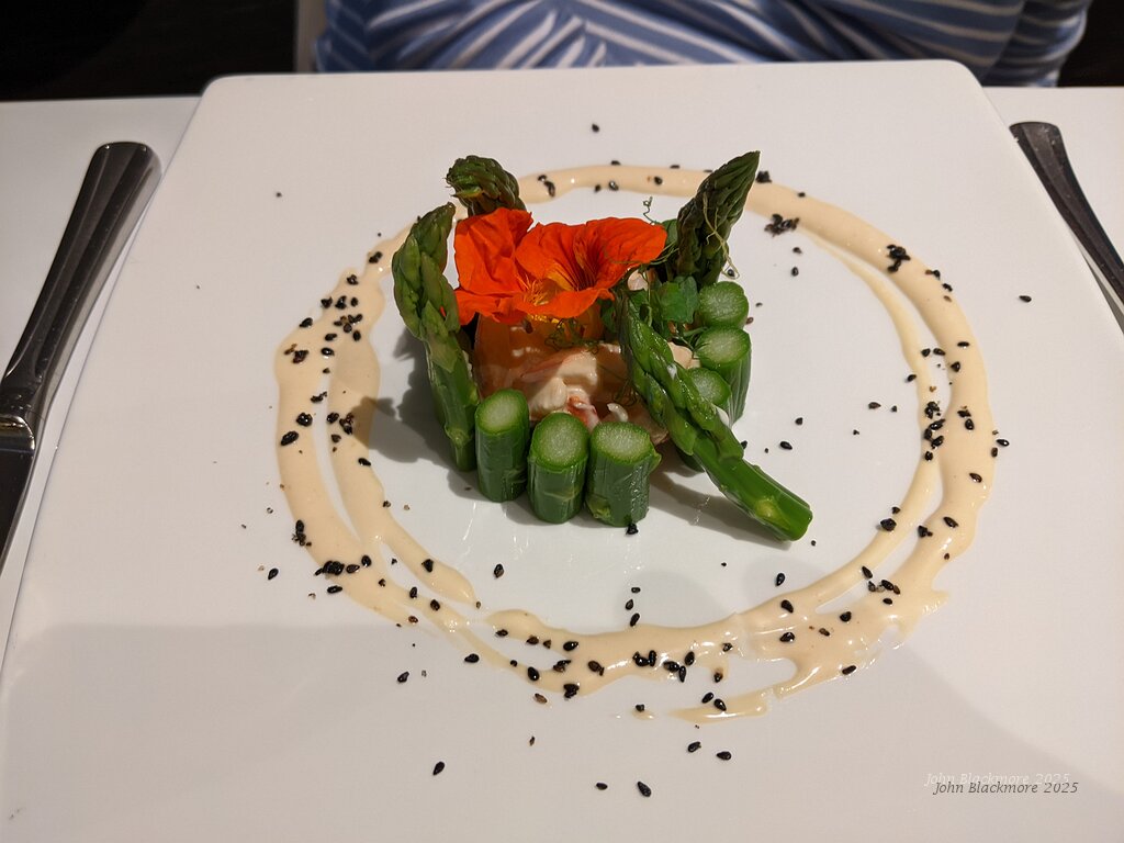 first: Charlotte d'asperges vertes au Tourteau, sauce cocktail crémée