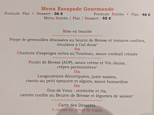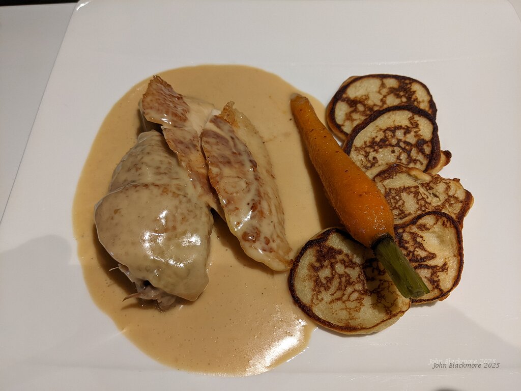 main: Poulet de Bresse (AOP), sauce crème et Vin Jaune, crêpes parmentières