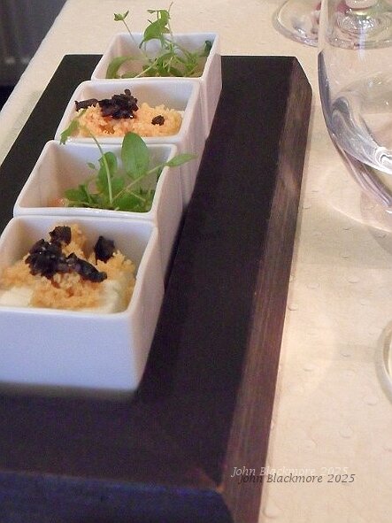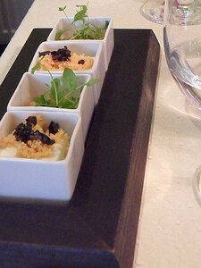 Amuse bouche: salmon and raisins and parmesan pana cotta with olives