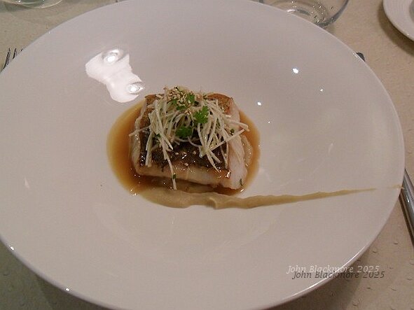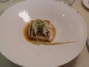 main: Pavé de colin grillé, oignons doux et cèleri au sésame, jus à la fève de Tonka