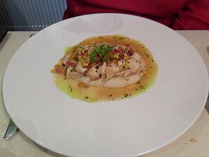 main: Suprème de volaille d'Alsace rôti, mousseline de haricots blancs, coing et chorizo, Jus façon diable