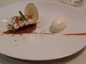 dessert: Lingot de pomme confite, crème fraîche légère, sauce caramel et glace vanille