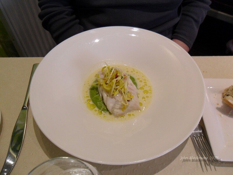 main:pavé de cabillaud cuit à basse température, mousseline de petits pois, lard croustillant et bouillon citronnelle