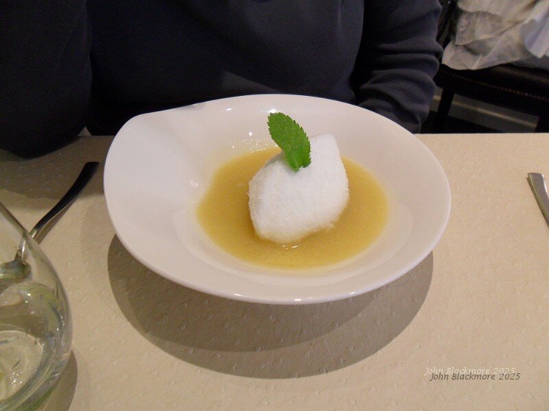 dessert: ile flottante pêche abricot, blanc d'œuf coco
