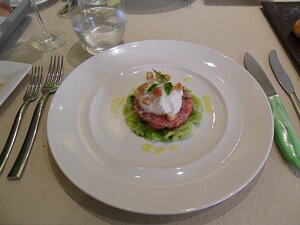 20120627_SAM_0654_ES71 starter: tartare de veau au citron et estragon, salade de poireaux et émulsion fumée