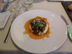 main: filet de gigot d'agneau rôti en viennoise de courgettes et parmesan, polenta et confit de tomates